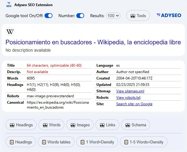 Aunque las mejoras en las búsquedas de Google son impresionantes, el verdadero valor de la extensión brilla cuando la usas para analizar páginas web individuales. Adyseo SEO Extension ofrece un conjunto de herramientas y funcionalidades que te ayudan a auditar y optimizar cualquier página para un mejor rendimiento en los motores de búsqueda.