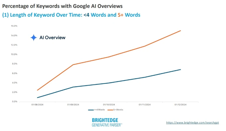 Uno de los cambios más significativos es la creciente presencia de los AI Overviews en los resultados de Google. Un estudio reciente de BrightEdge, titulado How AI Giants Are Carving Distinct Territory in the Search Landscape (enero de 2025), revela una gran expansión de su alcance, especialmente en consultas complejas y de múltiples pasos.